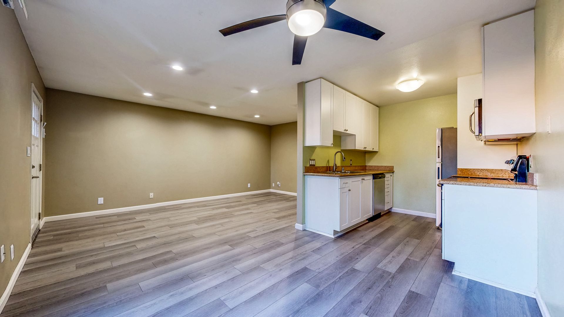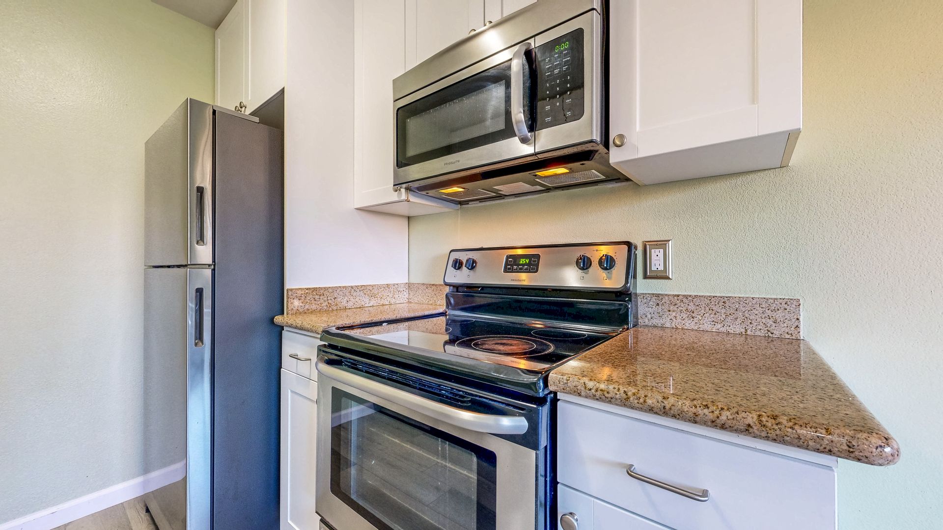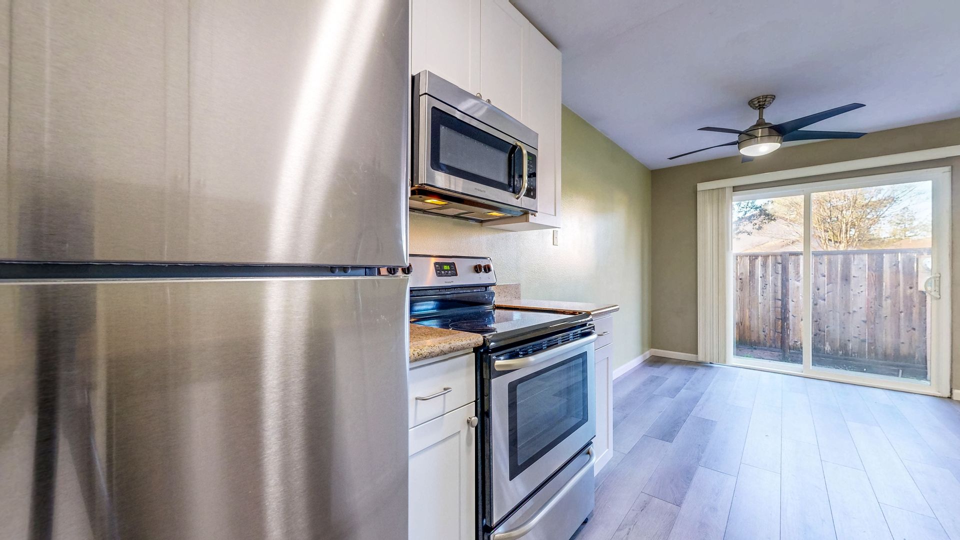 This single story unit features LVT and carpet flooring (new carpet in bedroom and walk in closet). Open concept Living room dining room. Kitchen features Quartz countertops and Stainless Steel Appliances such as Refrigerator, Electric Stove Stove, Built in Microwave and Dishwasher. Full bathroom enclosure is brand new (not reflected in pictures) and features a shower tub combo. Electric heating and ceiling fans. Washer and Dryer in garage included but not warranted. Pets possible with approval. 12 Month Lease. (EE)