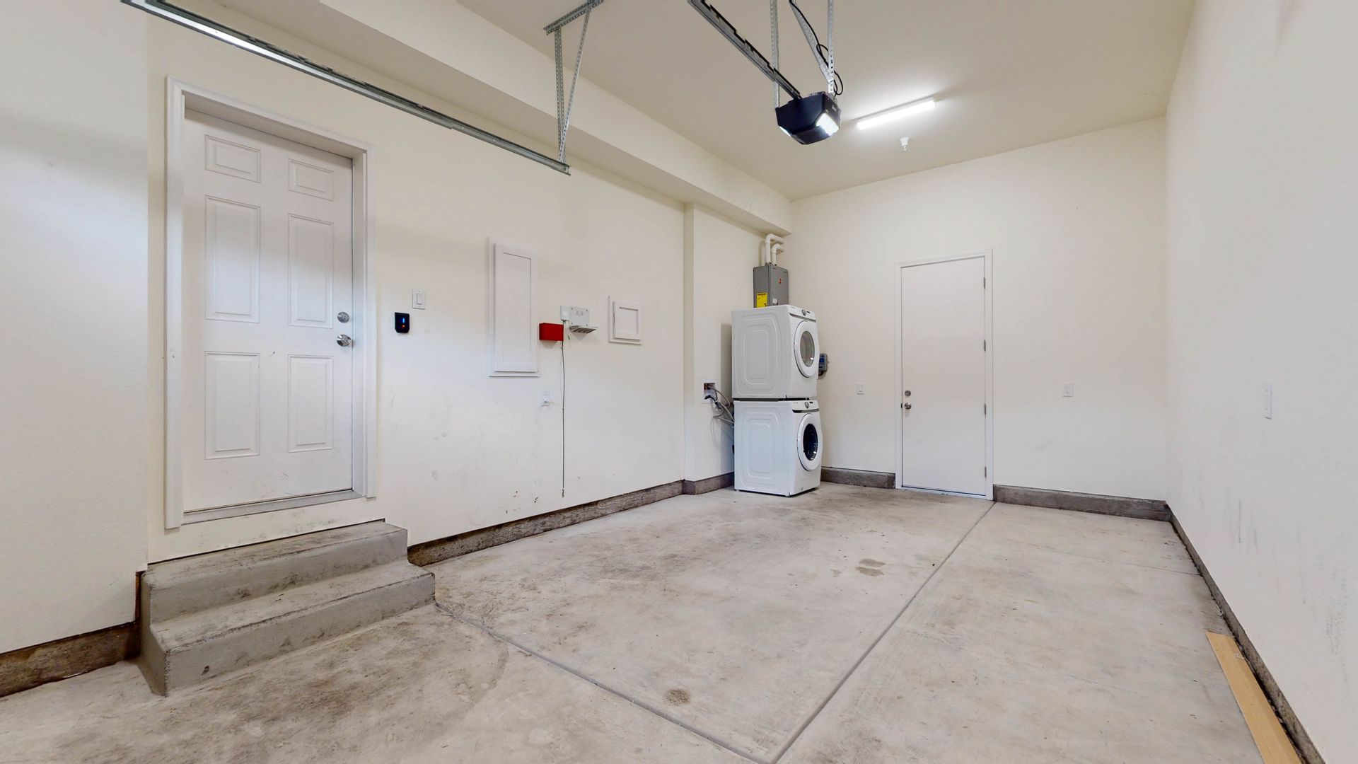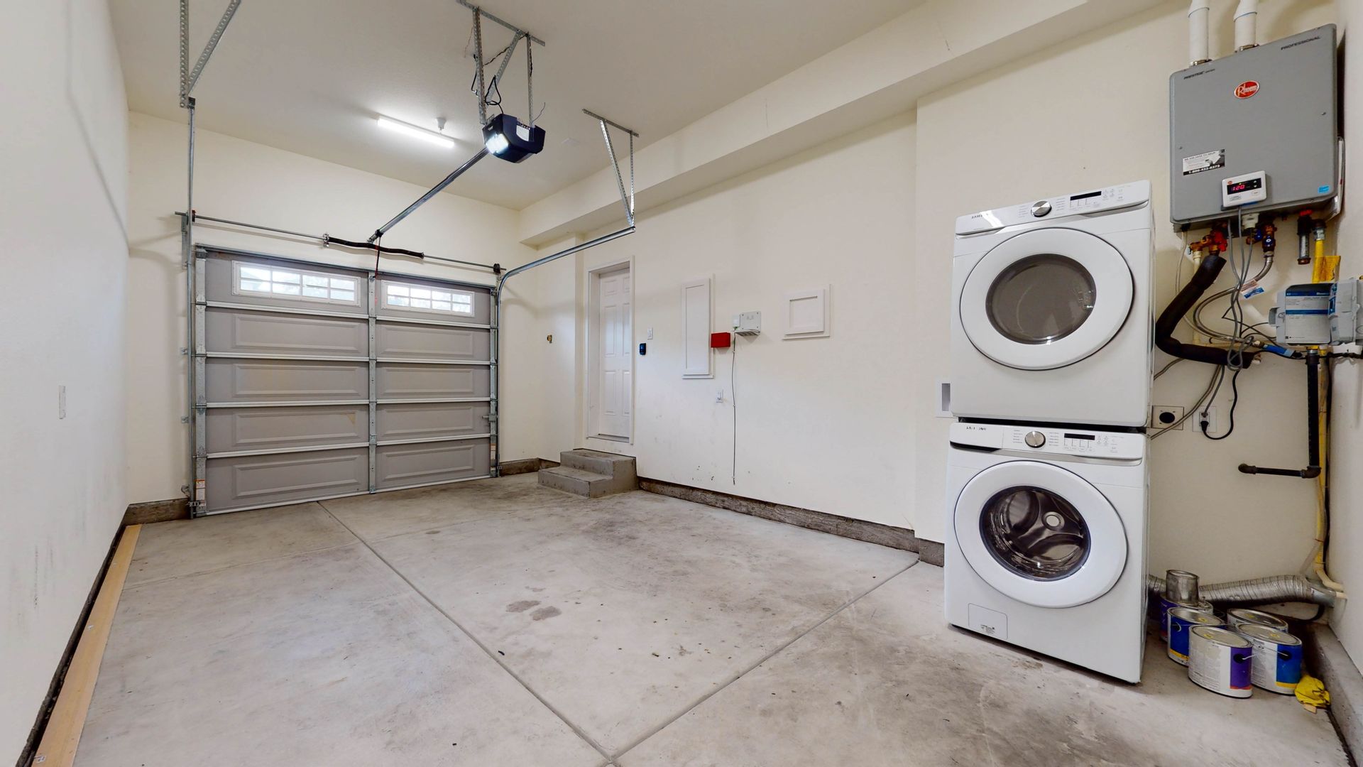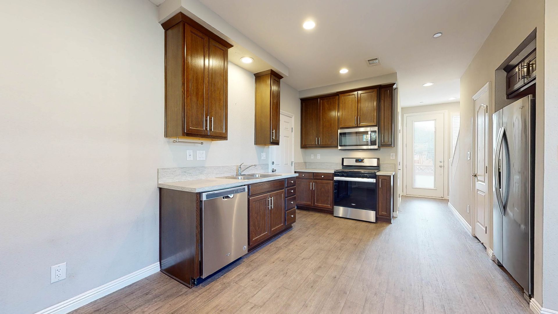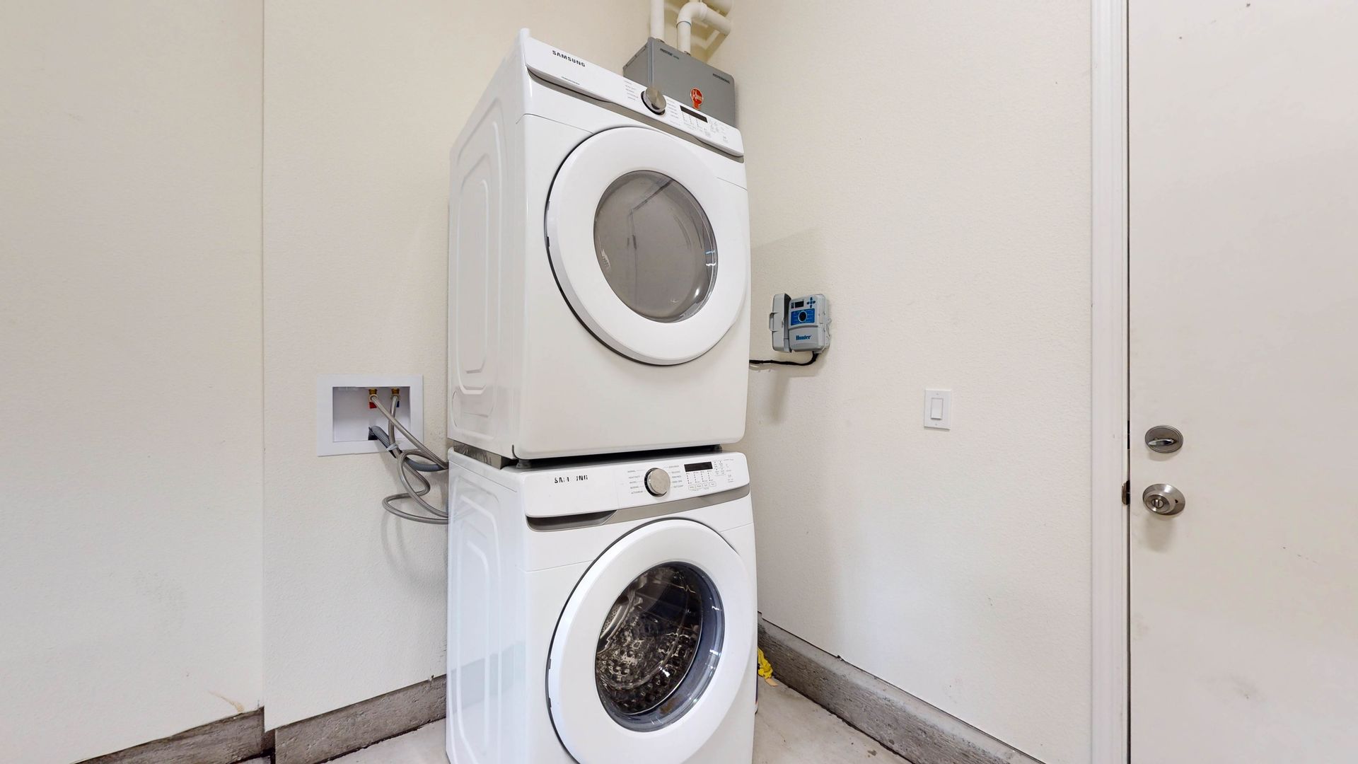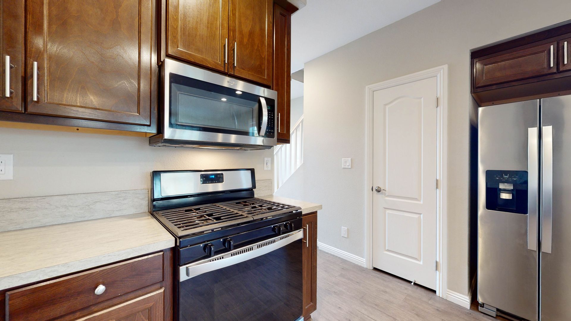 This beautiful 2 story home features solid flooring and carpet throughout. Open floor plan living/dining room connecting with kitchen downstairs and one full bathroom with shower tub combo. Kitchen features stainless steel appliances such as Gas Stove, Built in Microwave, Dishwasher and Refrigerator. All 3 bedrooms and 2 full bathrooms are located upstairs. Guest bathroom has shower tub combo and primary bathroom has a walk in shower as well as dual sink countertops. One oversized car garage with Washer and Dryer included. Central Heat.