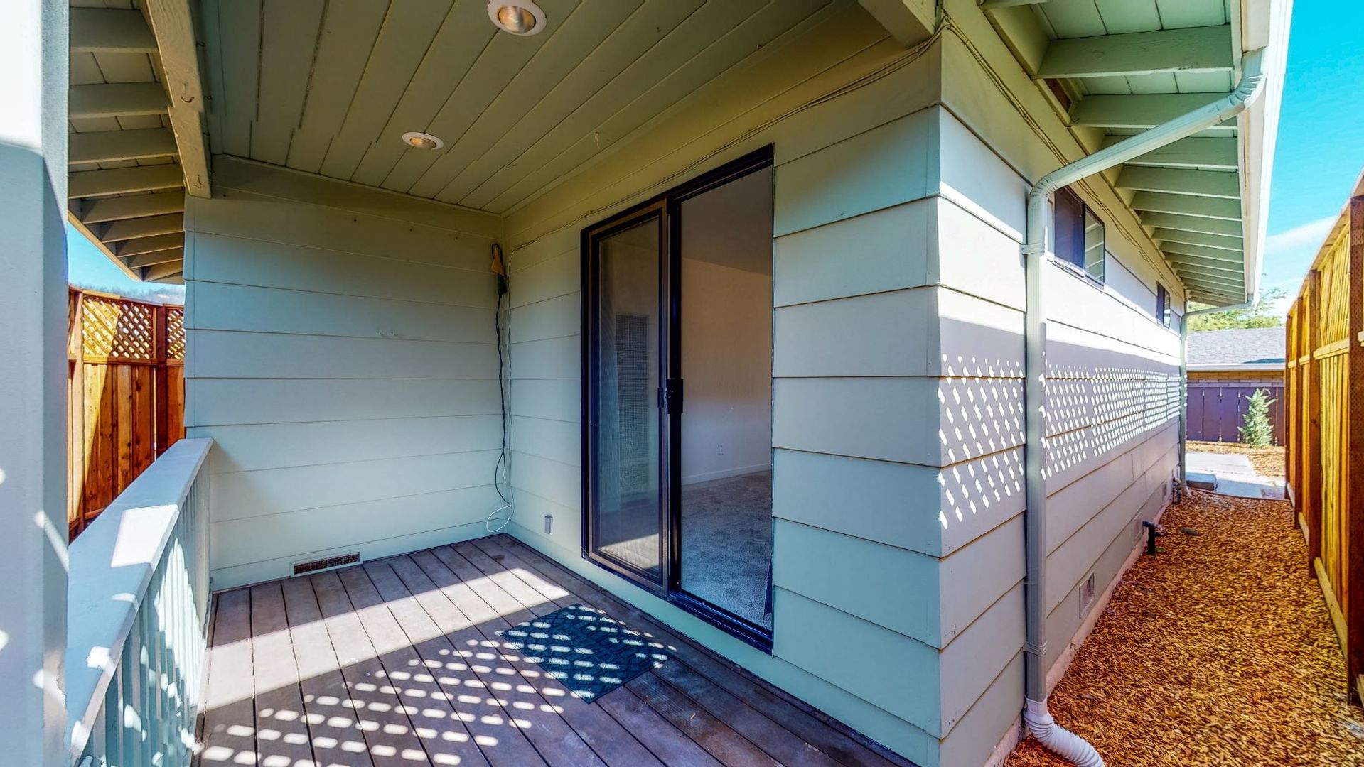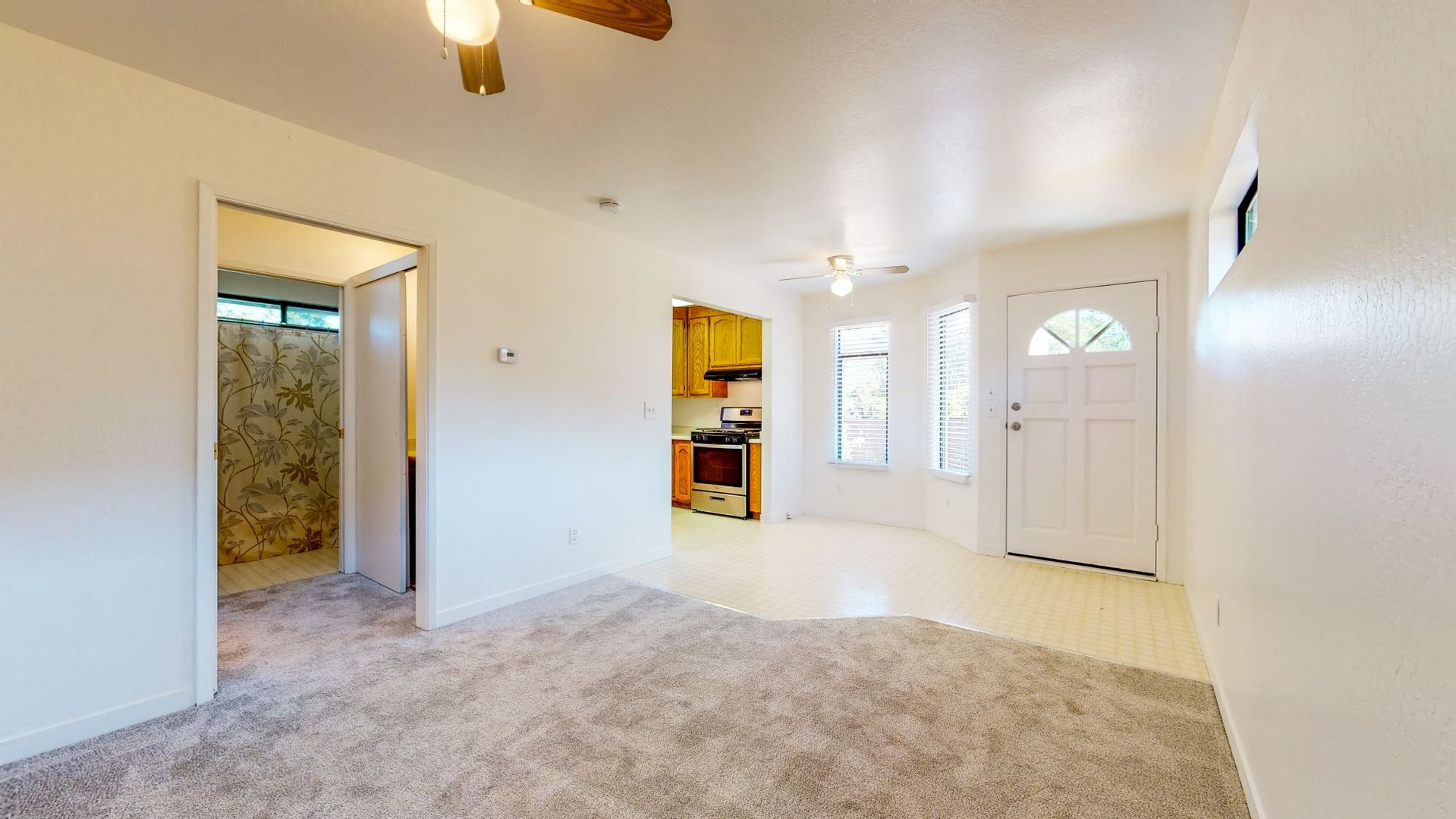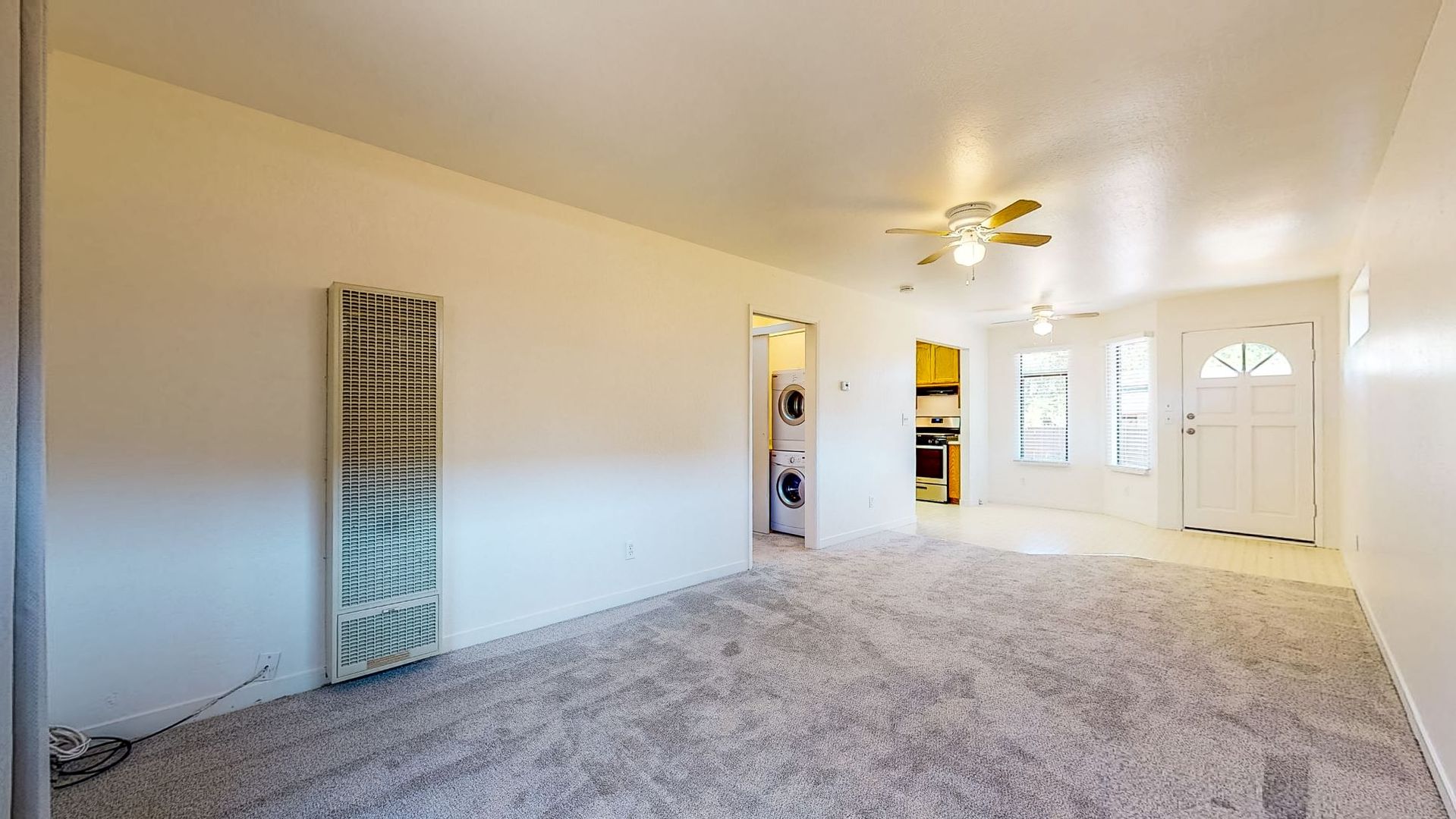 As you enter the property you are greeted by a spacious living room with plush carpet flooring that features a wall heater and ceiling fan. There is also a sliding glass door that leads out to a private deck. Kitchen has a Gas Stove, Refrigerator, and Microwave. The bedroom is of ample size and features a walk-in closet and ceiling fan. Bathroom has a shower tub combo. Stacked Washer and Dryer in unit. Large private yard with many fruit trees!
