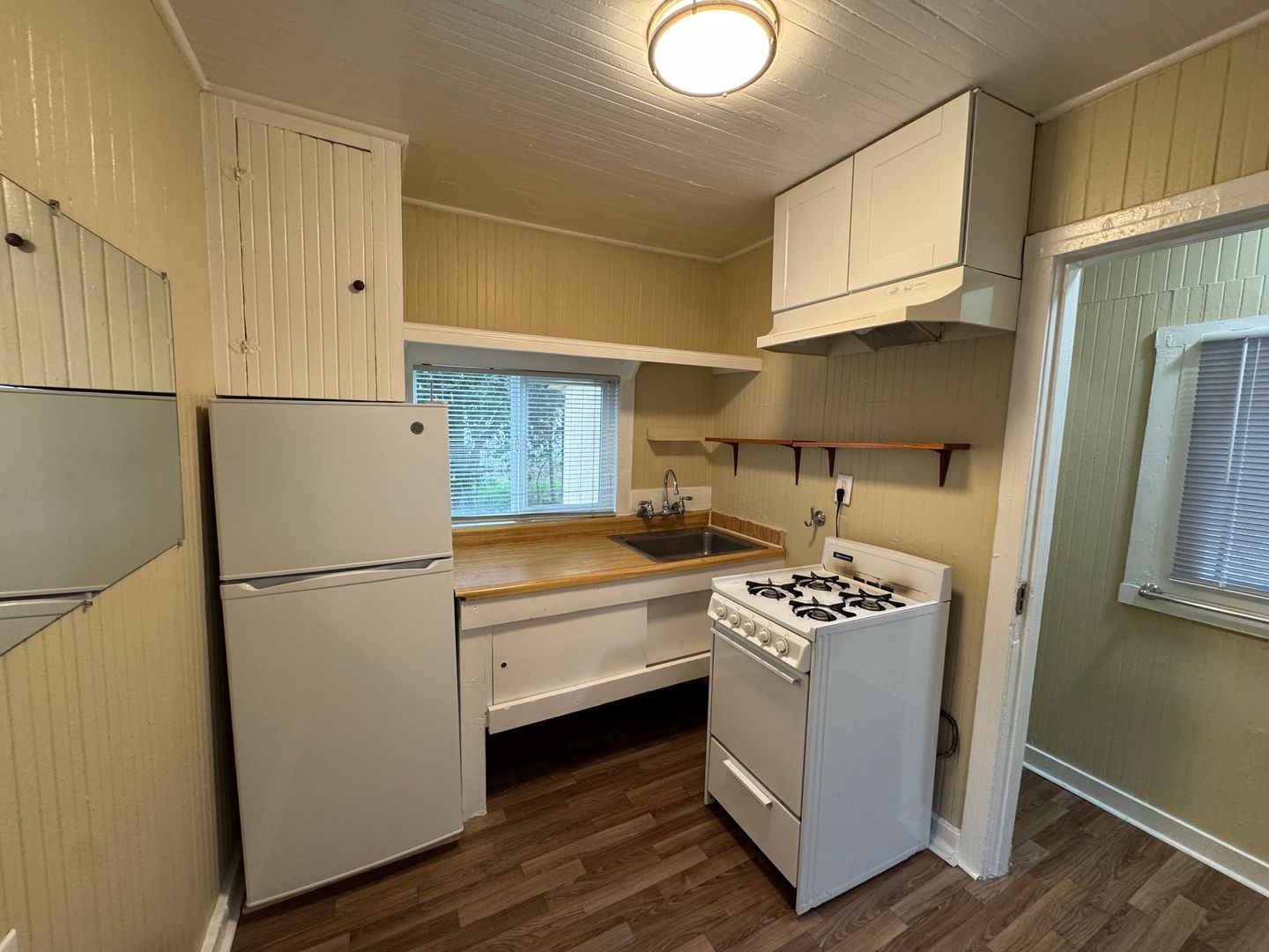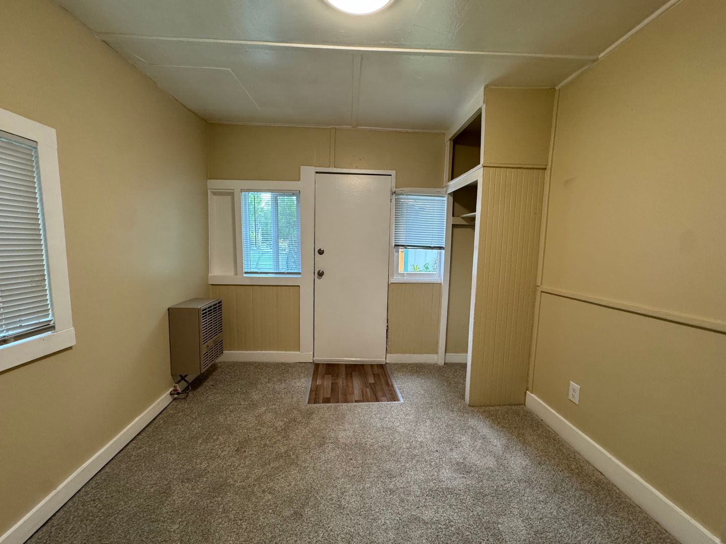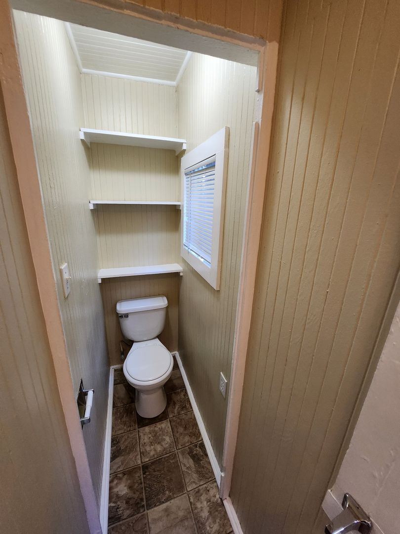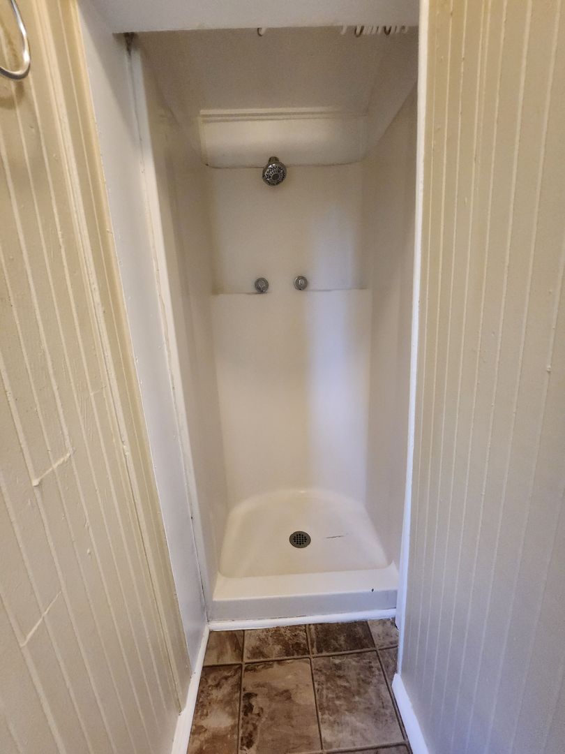 This studio has new plush carpet flooring. A separate kitchen with gas stove, refrigerator and space for a small table. The Bathroom comes with a walk in shower. Wall heating. Very large open outdoor yard.