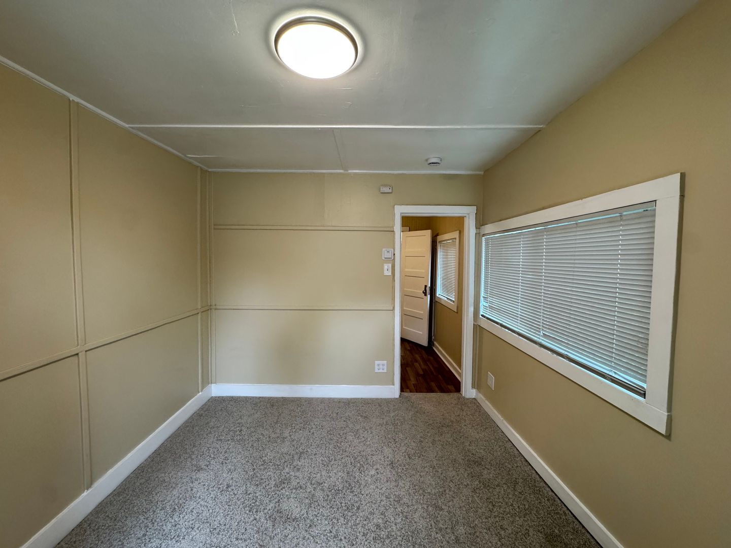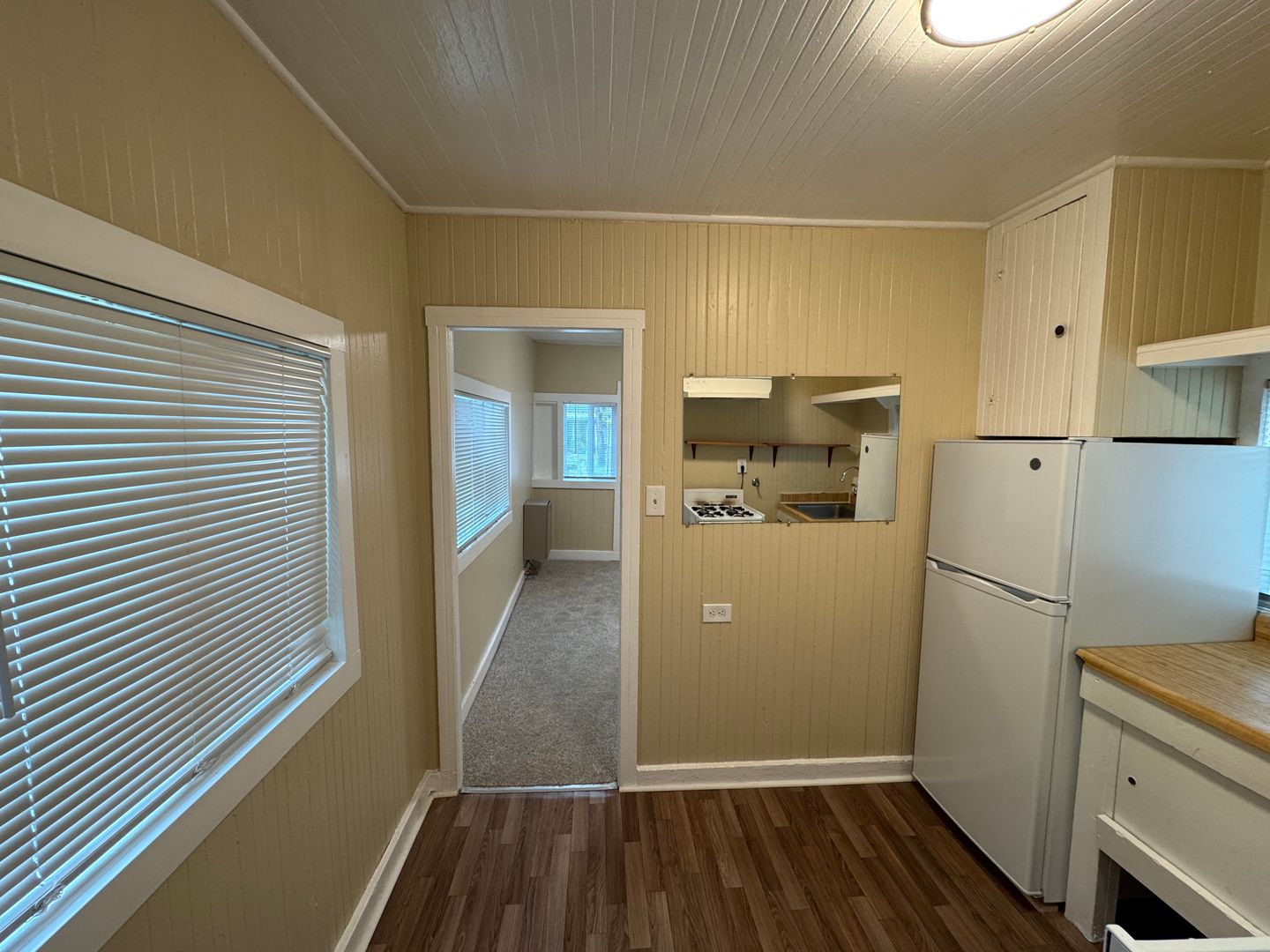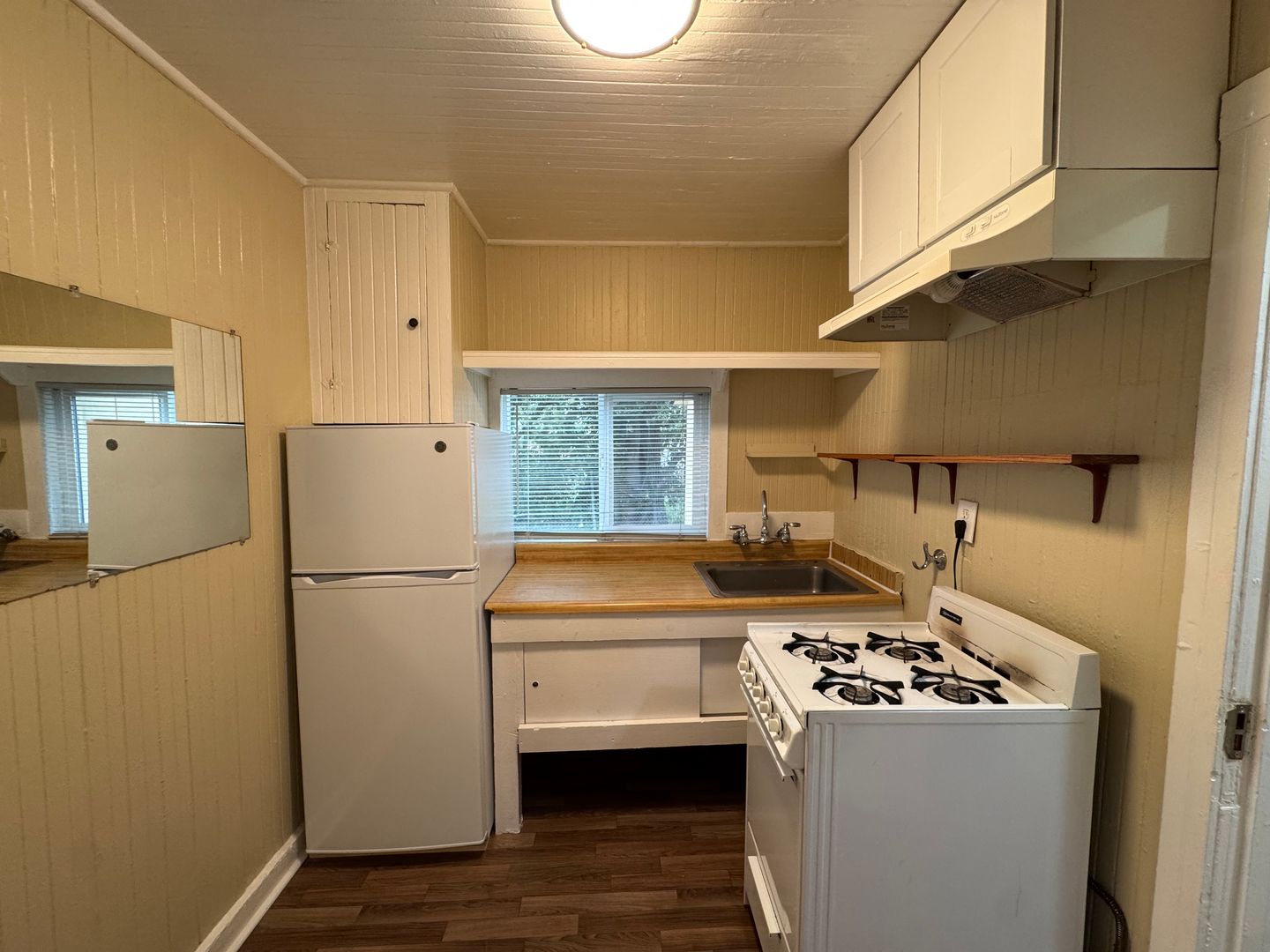 This studio has new plush carpet flooring. A separate kitchen with gas stove, refrigerator and space for a small table. The Bathroom comes with a walk in shower. Wall heating. Very large open outdoor yard.